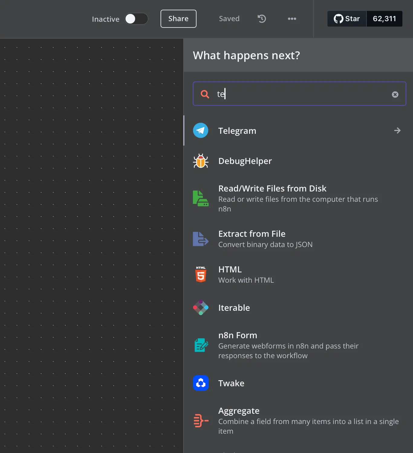 Telegram과 관련된 노드를 워크플로우에서 사용하기 위해 Telegram Node를 검색하였습니다.
