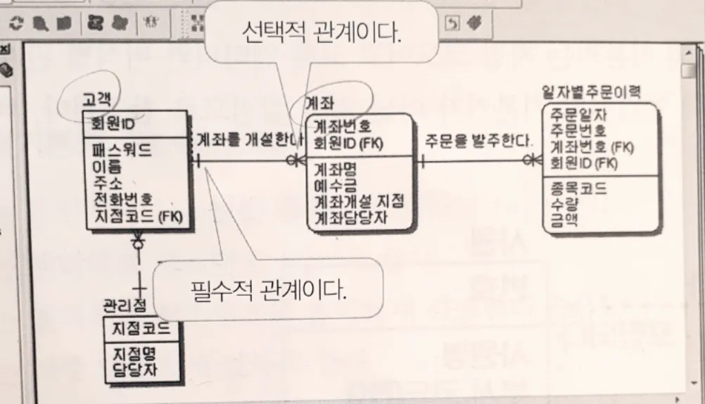 - 예를 들어 관리점 엔터티의 기본키는 지점 코드이고 고객 엔터티와 비식별 관계를 가지고 있다.