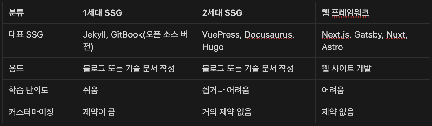 - 정적 사이트 생성기는 동적인 콘텐츠가 없는 웹 사이트를 만들기 위해 사용됩니다.
