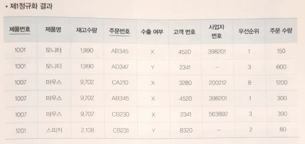 - 제품번호는 1001, 1001 등이 한 번 이상 나오므로 중복되고, 주문번호 또한 AB345가 두번 나와서 중복된다.